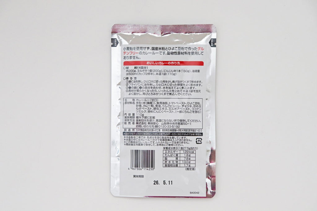 原材料名:米粉(国産)、食用油脂、トマトペースト、ひよこ豆粉、砂糖、食塩、カレー粉、りんごピューレ、チャツネ、炒め玉ねぎペースト、ミルポアペースト、ココナッツミルク、酵母エキス、炒めにんにくペースト(原材料の一部にリンゴを含む)