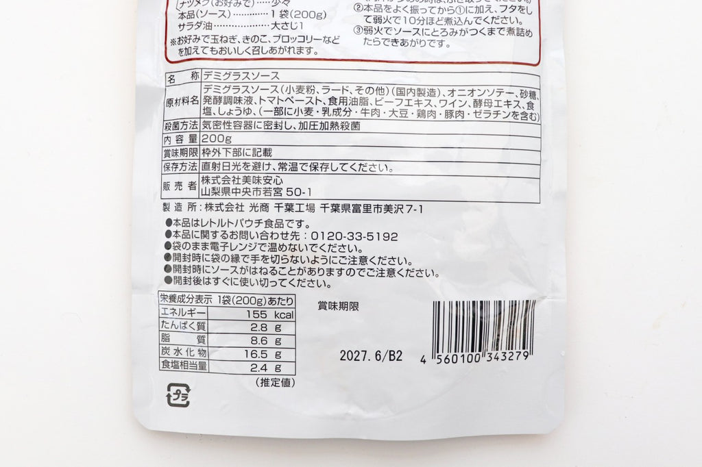 原材料名:デミグラスソース(小麦粉、ラード、その他)(国内製造)、オニオンソテー、砂糖、発酵調味料、トマトペースト、食用油脂、ビーフエキス、ワイン、酵母エキス、食塩、しょうゆ、(原材料の一部に小麦、乳成分、牛肉、大豆、鶏肉、豚肉、ゼラチンを含む)