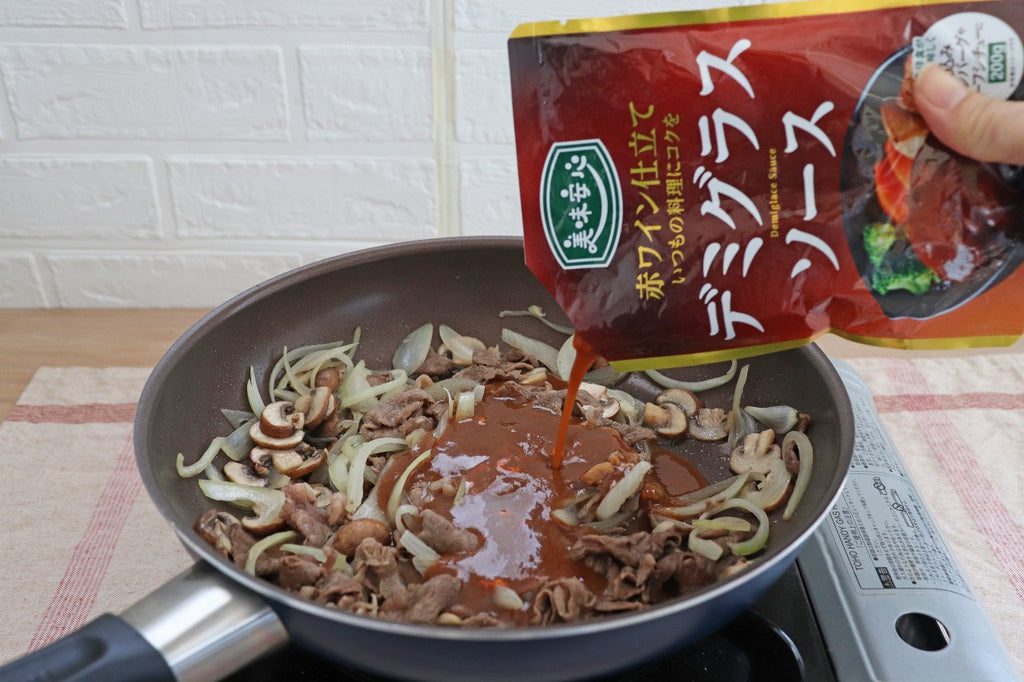 ハンバーグを焼いて、本品で煮込むだけでいつものメニューがワンランクアップします。
