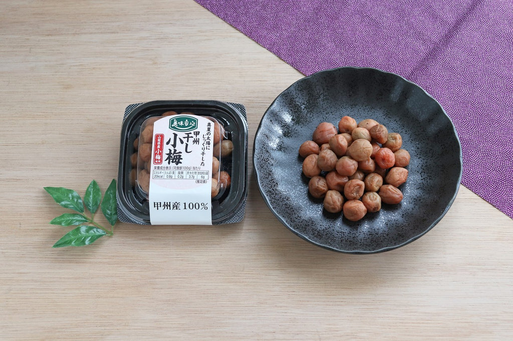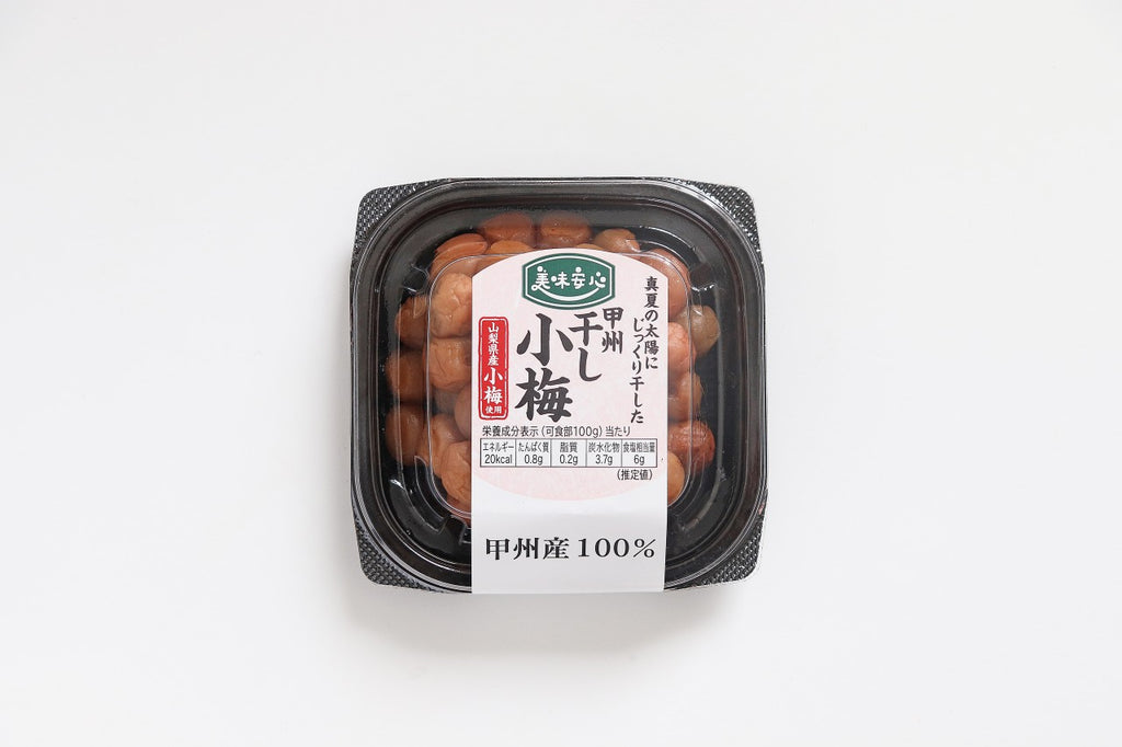 十分に天日干しをした甲州小梅だけを100%使用しました。山梨県は、小梅の生産量日本一の産地です。山梨は一日の寒暖差が激しいため、梅が栄養を身に溜めやすく、肉厚でタネが小さい梅干しができあがります。小さめなので、お弁当にぴったりです。